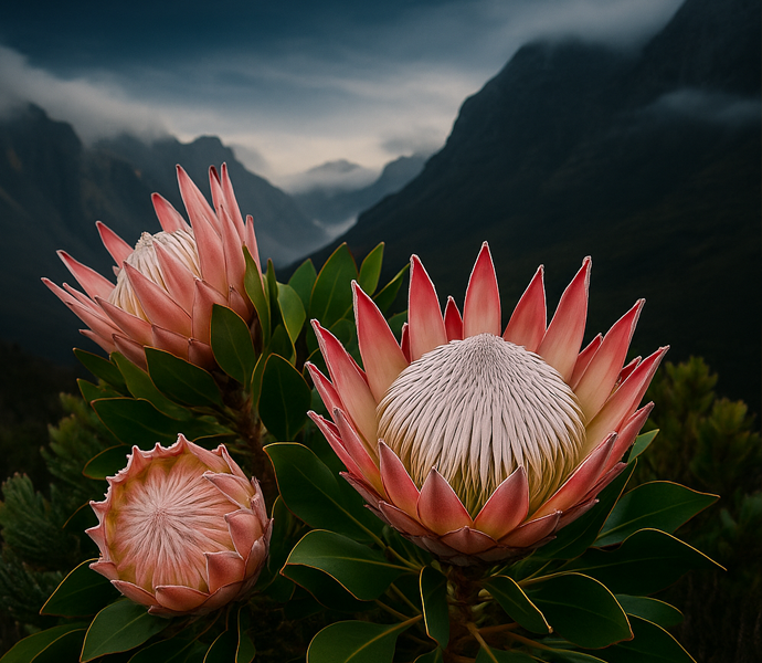 その象徴となるのが、大輪のキングプロテア。荒野の厳しい環境を生き抜き、堂々と咲き誇るその姿は、挑戦や努力、節目の時間を迎える人に、深い敬意と祝福を伝える象徴としてふさわしい存在です。